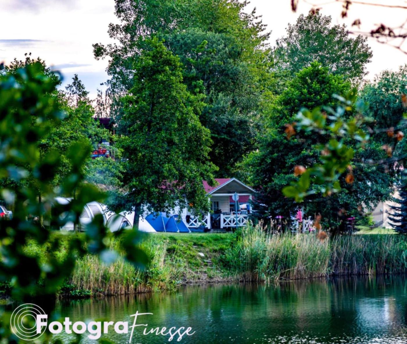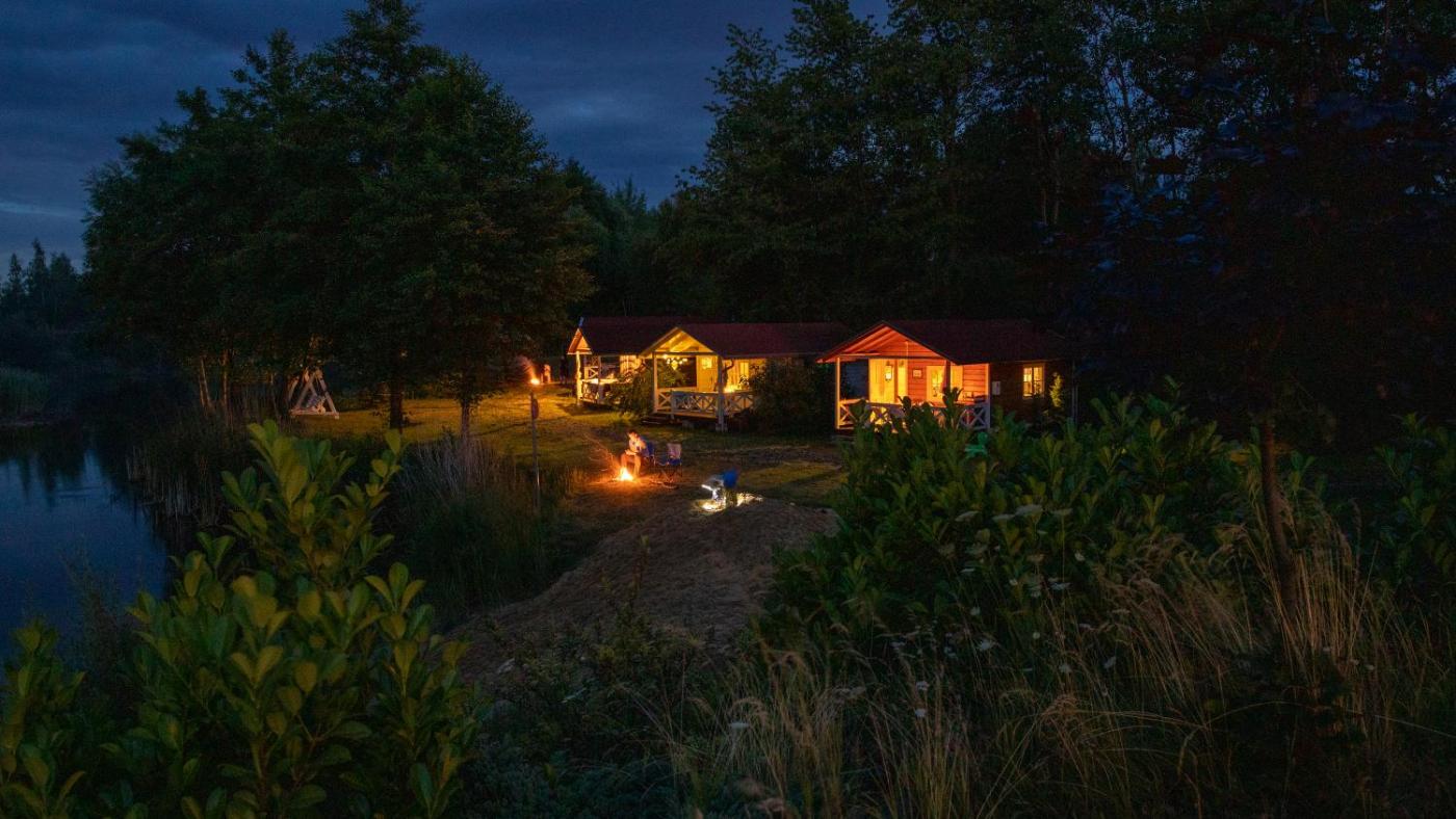 Rustykalne drewniane domki nad brzegiem prywatnego stawu, łazienki współdzielone